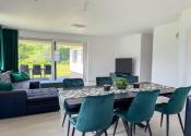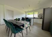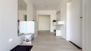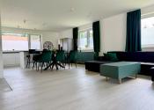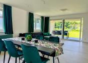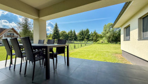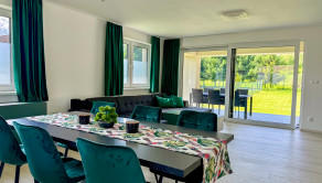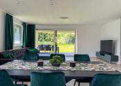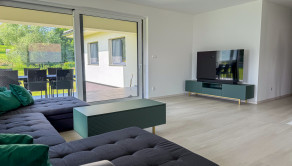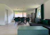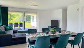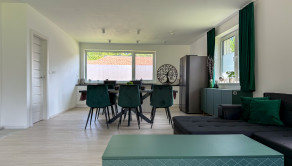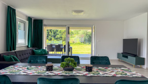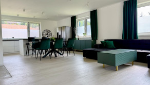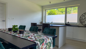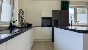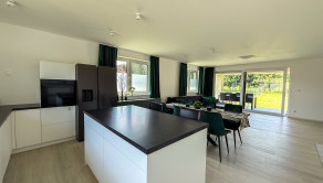 Hlavný denný priestor ponúka presvetlenú a priestrannú obývačku prepojenú s kuchyňou a jedálňou s rozlohou až 50 m². Veľká, priestranná a moderne vybavená kuchyňa so špajzou je srdcom domu a ponúka všetko, čo potrebujete pre pohodlné a štýlové varenie. Veľké okná a veľké presklené posuvné dvere prinášajú do interiéru množstvo prirodzeného svetla a zároveň výhľad a priamy vstup na terasu.