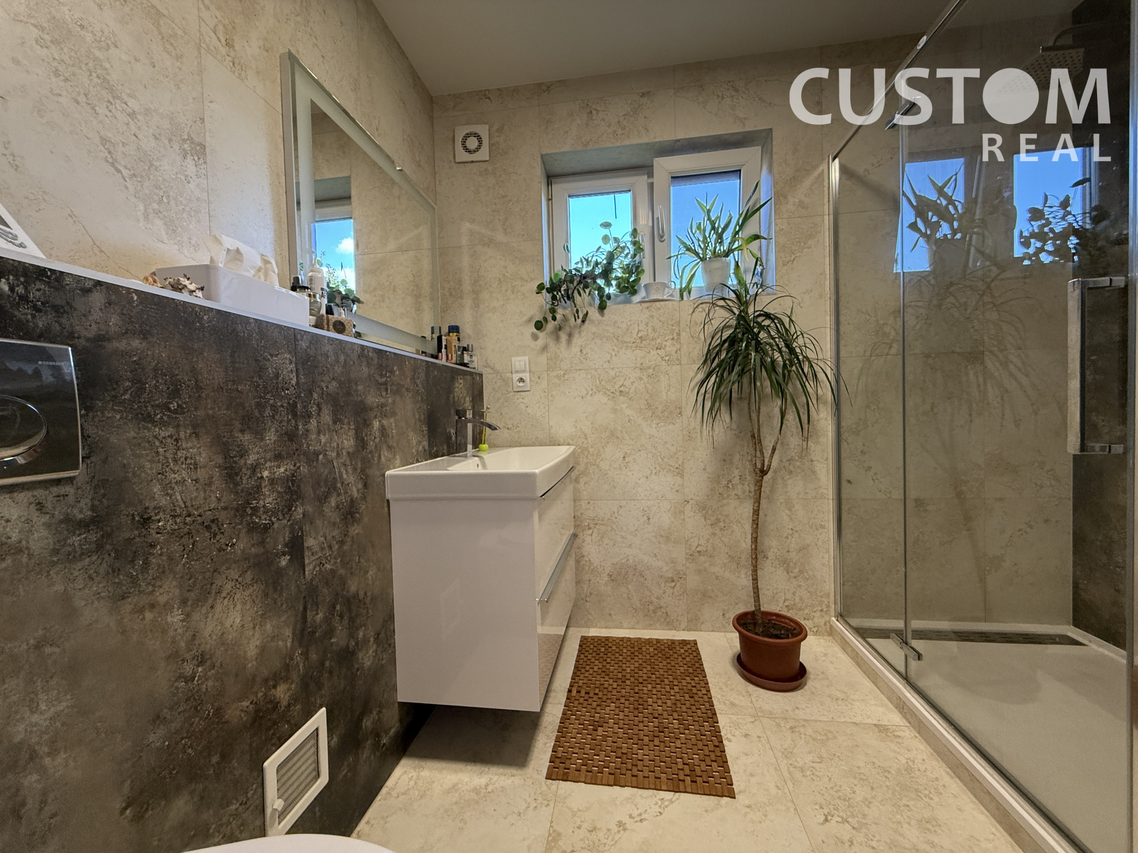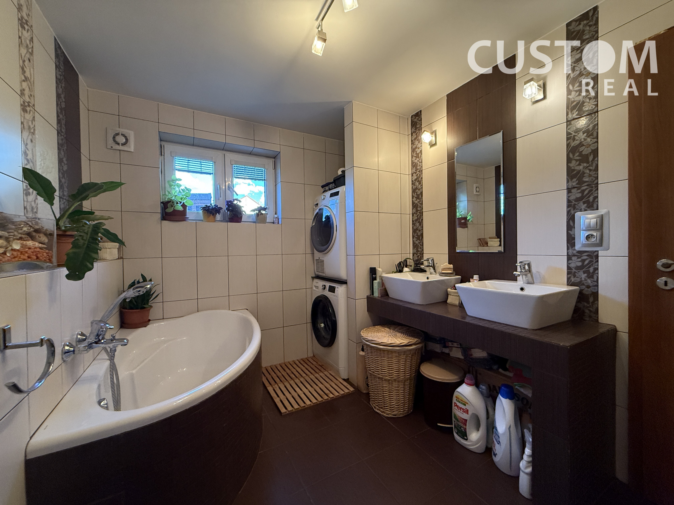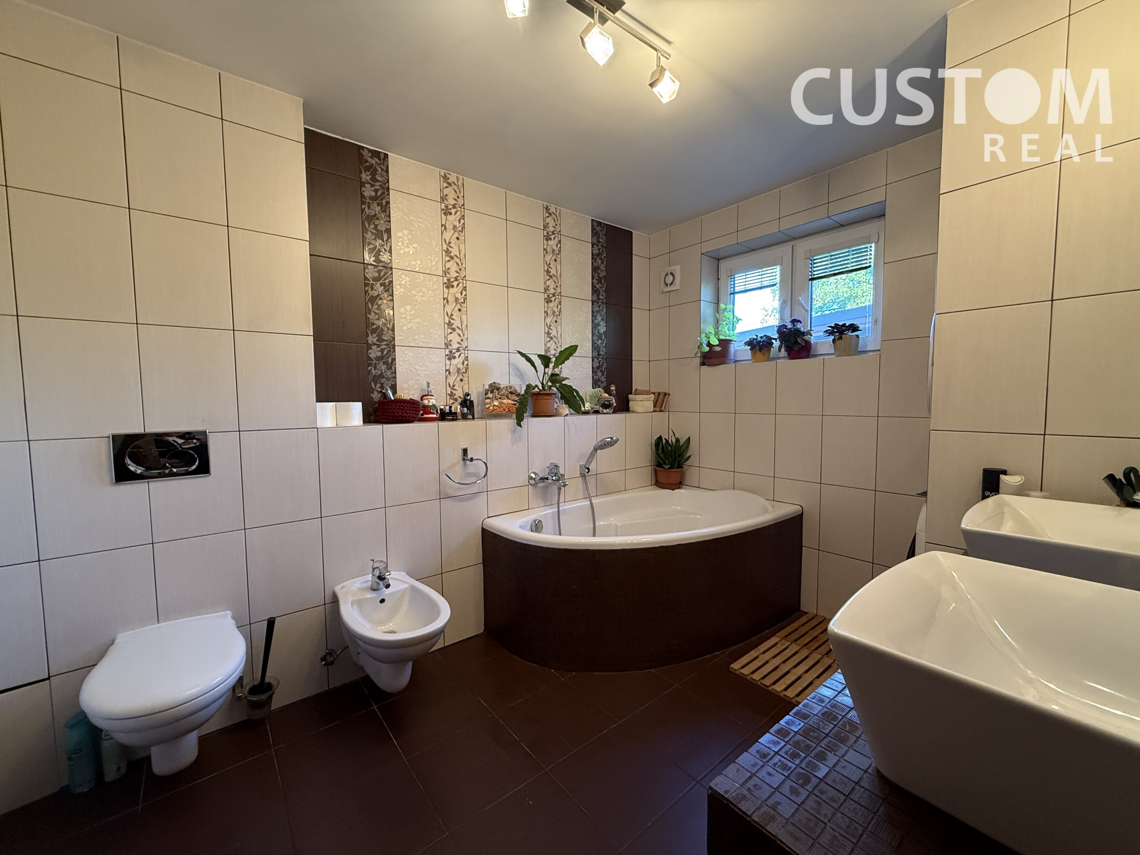- dve kúpeľne: prízemie – rohová vaňa, dve umývadlá, WC, bidet; podkrovie – sprchovací kút, WC