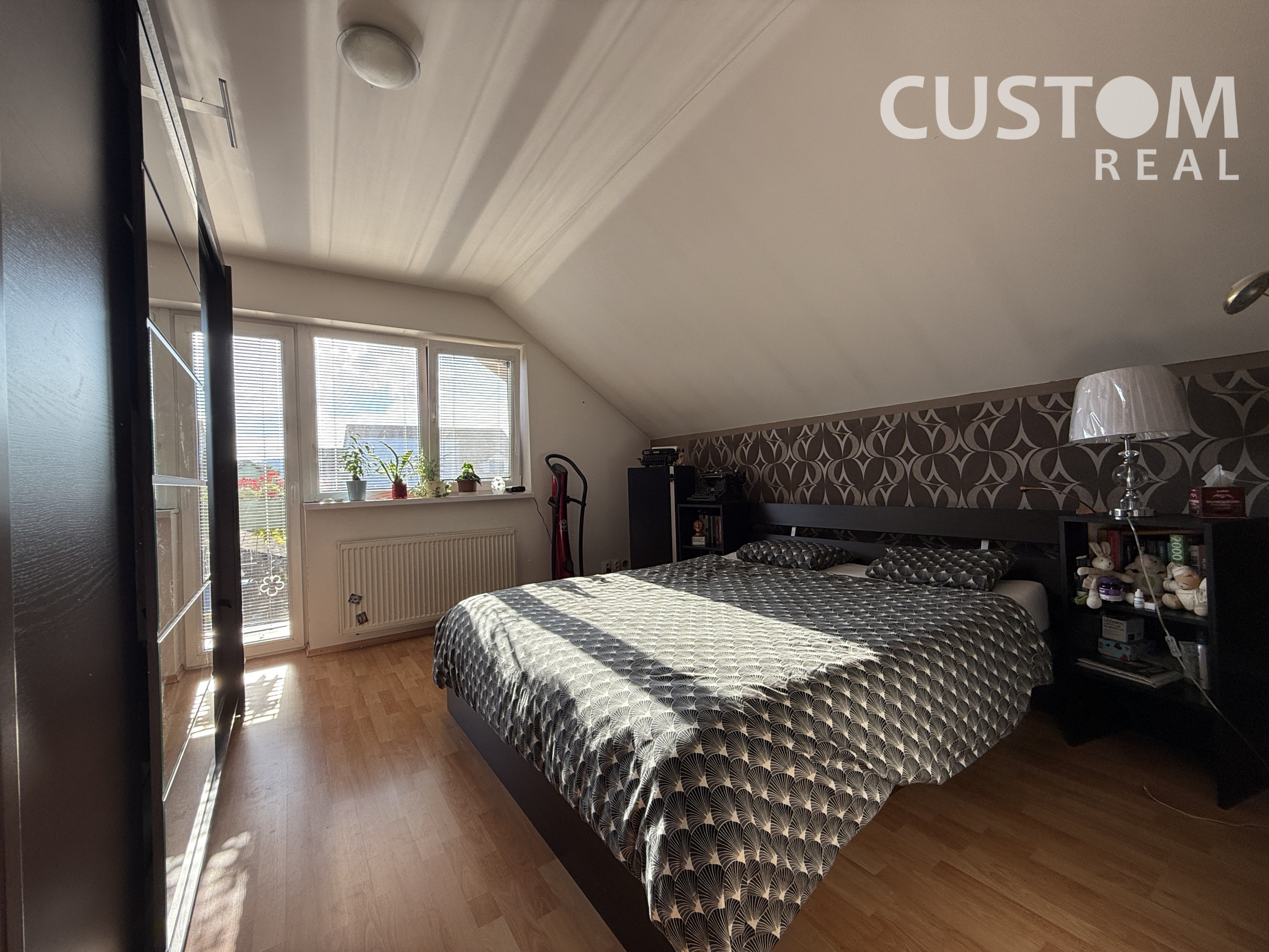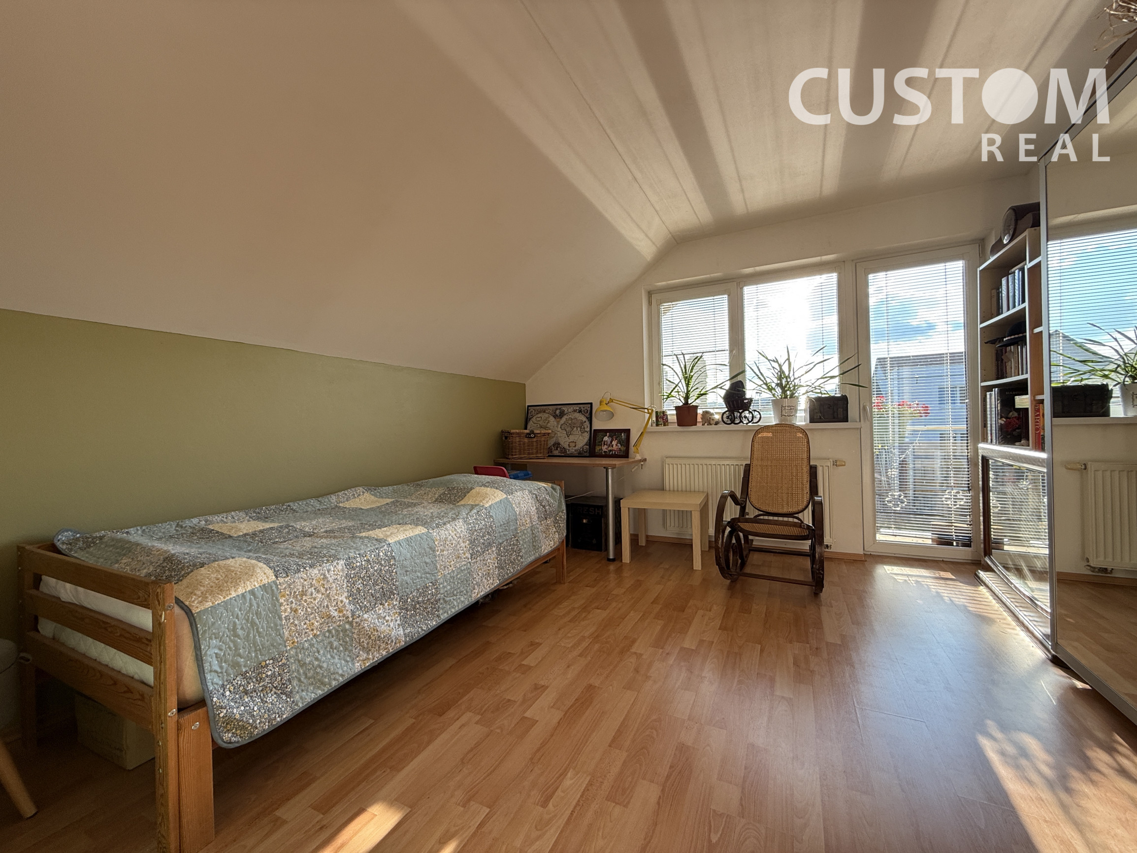 2. NP (podkrovie) – dve izby, priestranný šatník, kotol, veľká kúpeľňa so sprchovacím kútom a WC, dva balkóny