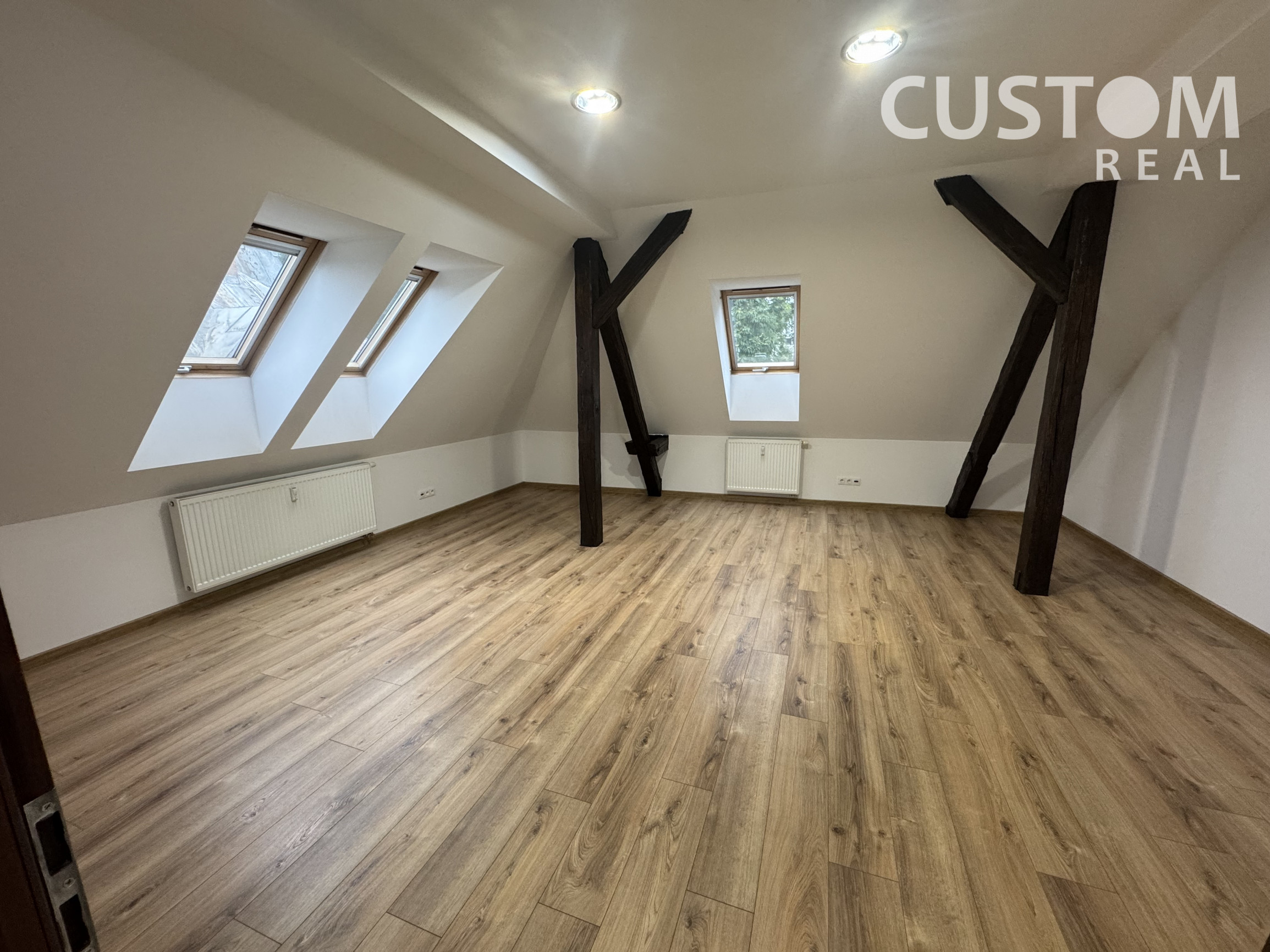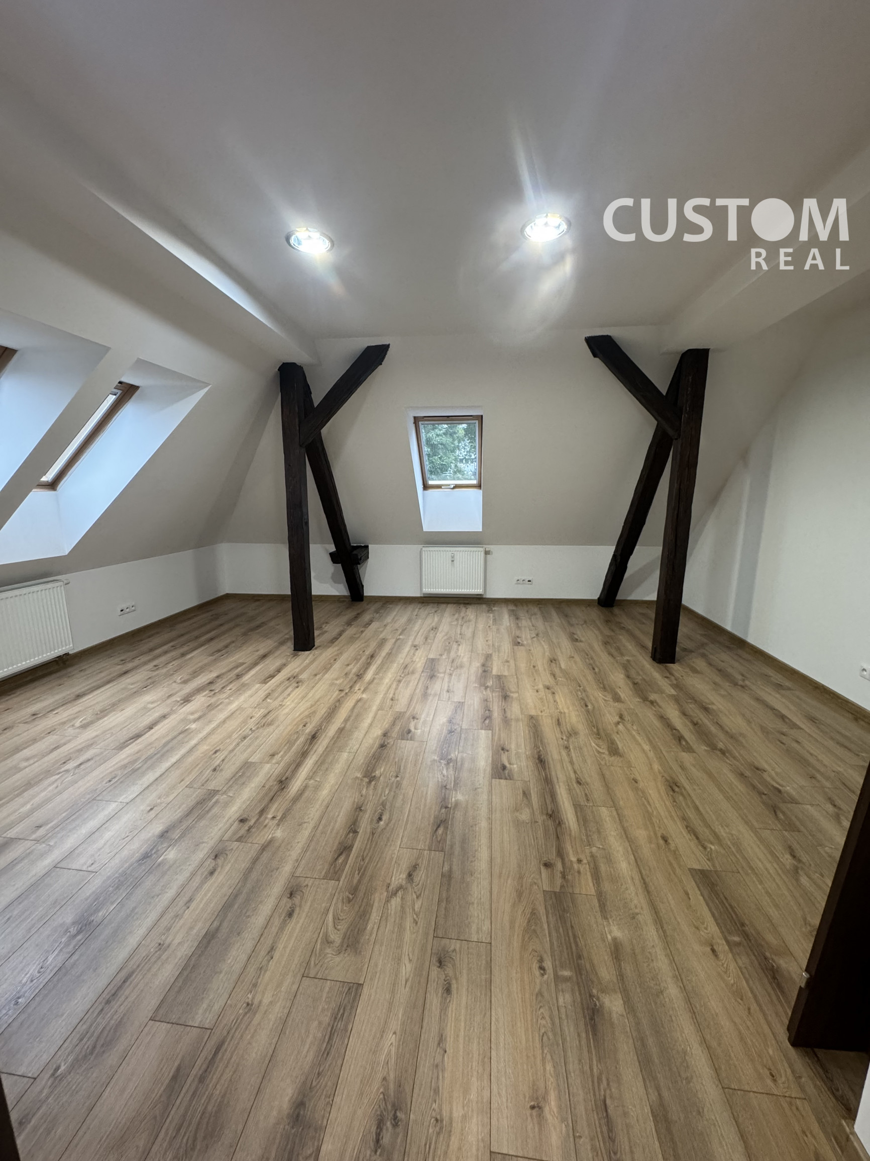 Kancelária je klimatizovaná, štýlovo riešená v podkroví s novou podlahou, so zachovanými drevenými trámami, ktoré dodávajú priestoru jedinečný charakter. Spoločné WC sa nachádza na chodbe.