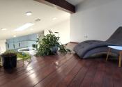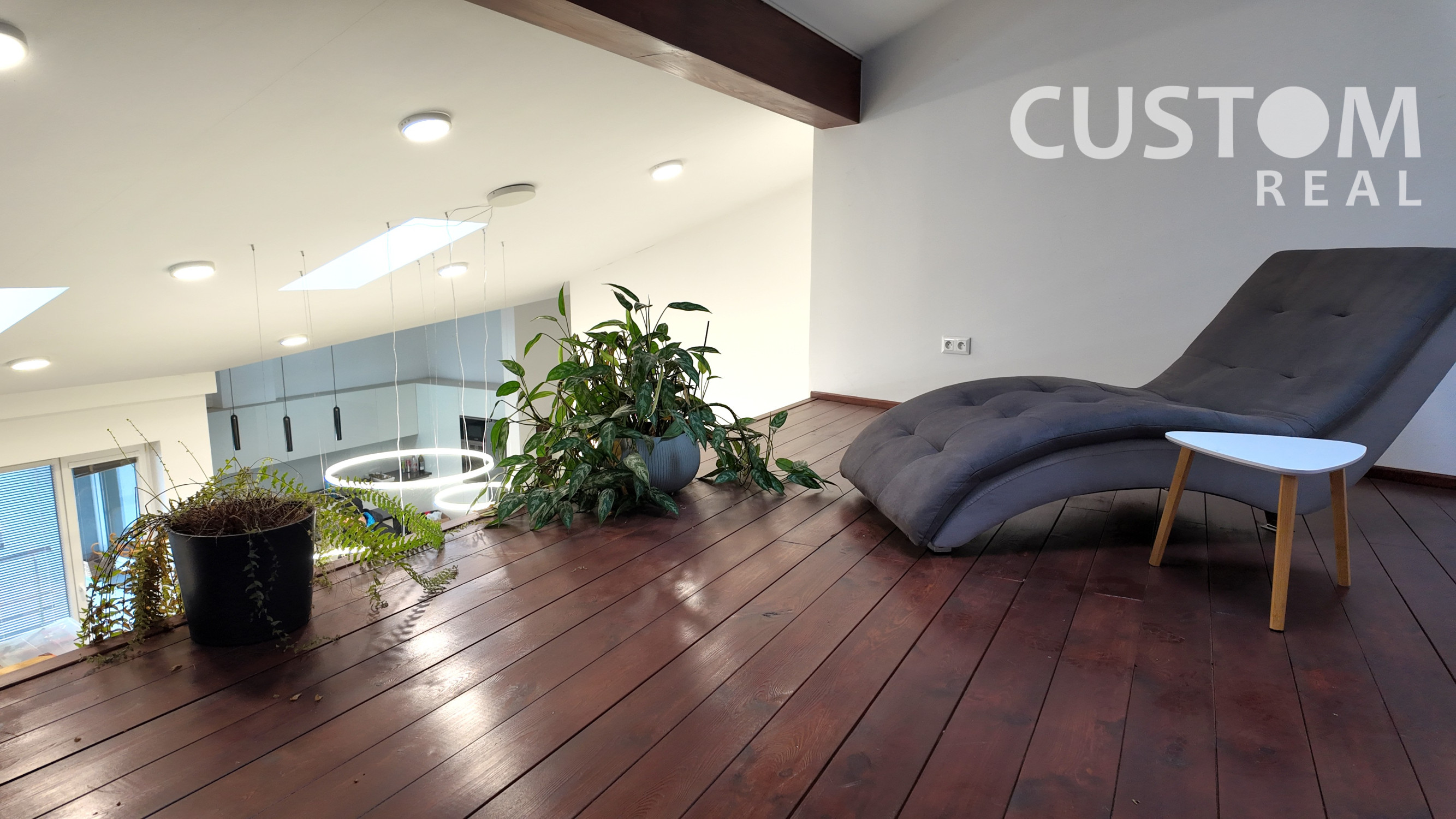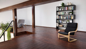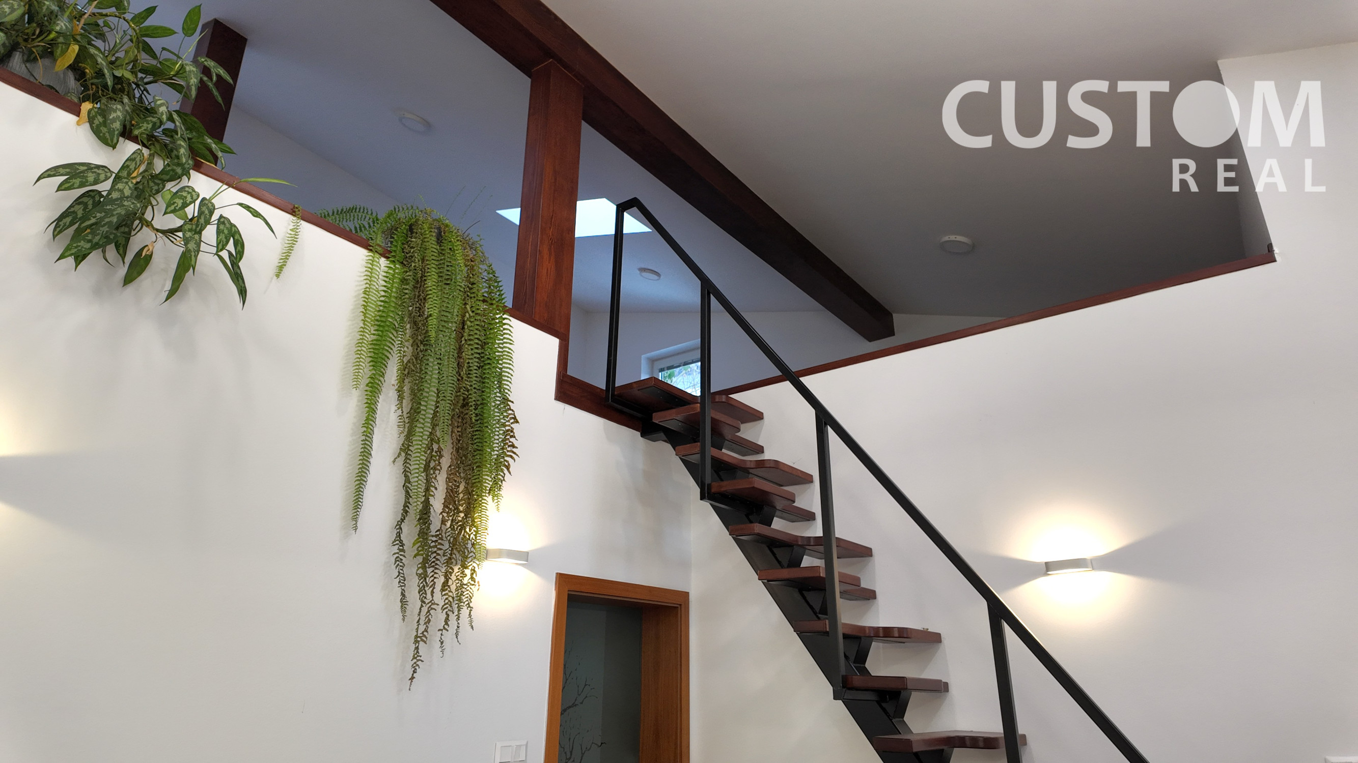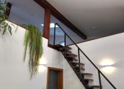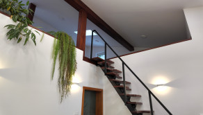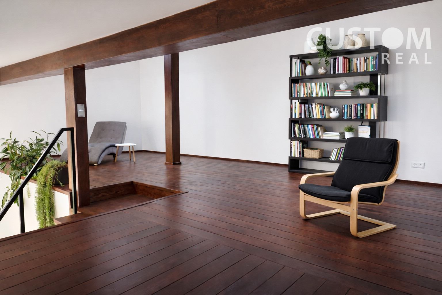 Z otvoreného priestoru vedie drevenné schodisko na galériu (knižnica).