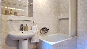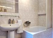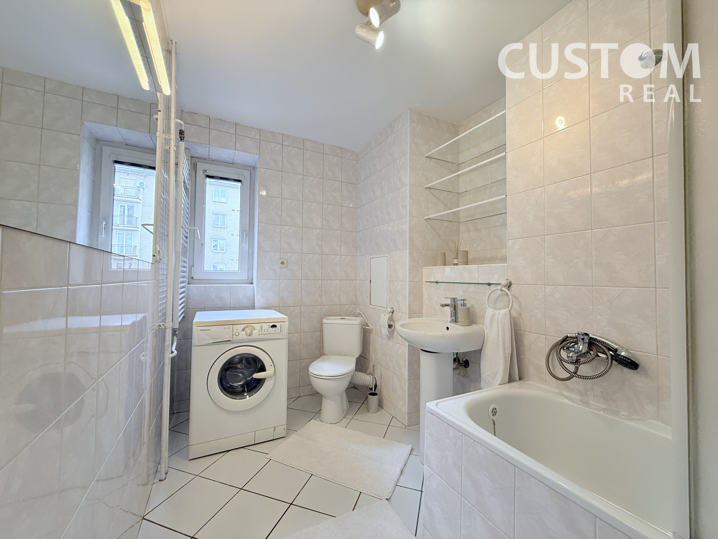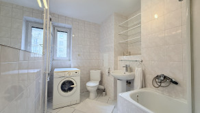 do priestrannej murovanej kúpeľne s vaňou, WC a oknom