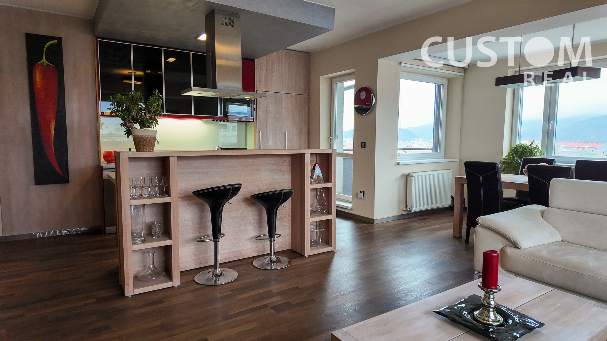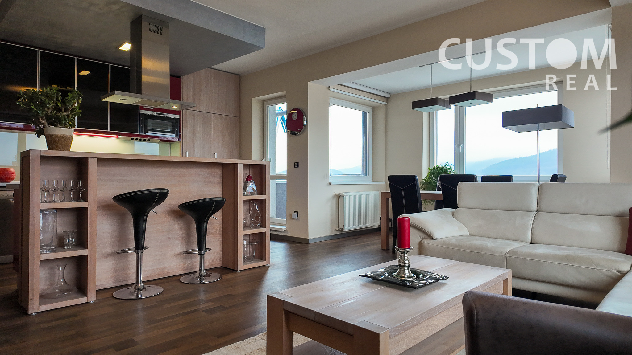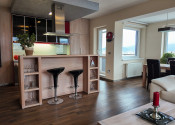 Dispozične pozostáva z otvorenej dennej časti, ktorú tvorí kompletne zariadená kuchyňa prepojená s jedálňou a obývacou izbou, ďalej z dvoch samostatných spální, kúpeľne a oddelenej toalety.