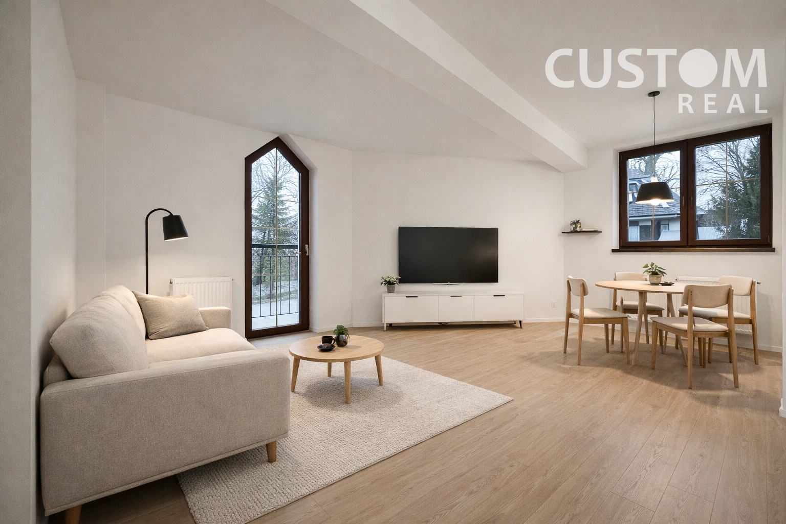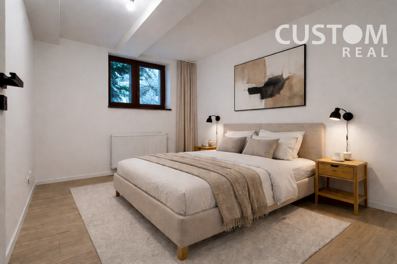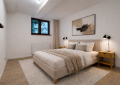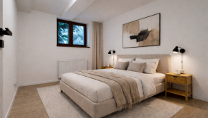 Vizualizácie v inzeráte ukazujú, ako môže interiér pôsobiť – svetlo, nadčasovo a s jemným hotelovým charakterom, ktorý je ideálny pre krátkodobý prenájom alebo víkendové bývanie.